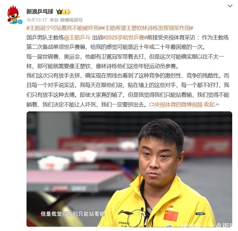 王皓赛前坦言“这是近二十年来最繁重的一次世乒赛”,并敕令队员“终局去搏,宁可站着输,也毫不可躺着输、或被吓死,咱们一定要拼出去”,这番言论本意为年青球员减压,却因“提前预设失败”的语境激发球迷不悦,更深层的问题在于,王皓的记挂折射出遴荐机制与战术想象的脱节,尤其是国乒正处于新老轮流的重要期,马龙、樊振东等中枢缺席,王楚钦、林诗栋等腾达代被动挑大梁,但他们的海外大赛教学与口头踏实性尚未经充分熟习