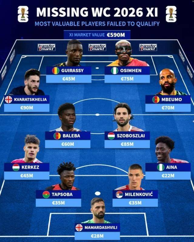 11月19日讯 德转社媒晒图,列出无缘2026世界杯球员中身价最高的首发威望,奥斯梅恩、姆伯莫、K77、索博斯洛伊等多名球星在列。 无缘世界杯身价最贵阵(单元:欧元) 前卫:克瓦拉茨赫利亚(格鲁吉亚、9000万)、吉拉西(几内亚、4500万)、奥斯梅恩(尼日利亚、7500万)、姆伯莫(喀麦隆、7000万) 中场:巴莱巴(喀麦隆、6000万)、索博斯洛伊(匈牙利、8500万) 后卫:凯尔凯兹(匈牙利、4500万)、塔普索巴(布基纳法索 、3500万)、米伦科维奇(塞尔维亚、3500万)、艾纳(尼日利亚、2200万) 门将:马马尔达什维利(格鲁吉亚、2800万) 买断费仅需3千万!拉什福德本赛季已6次助攻是五大联赛同时最多