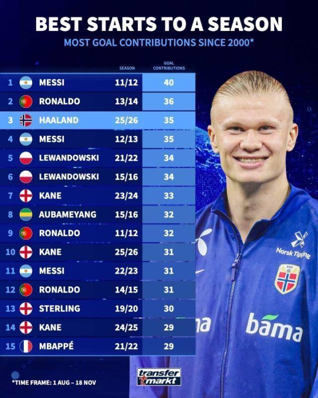 仅次于梅罗!本世纪赛季开局进球孝顺数:哈兰德35球位列历史第三